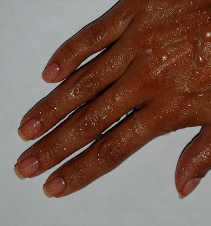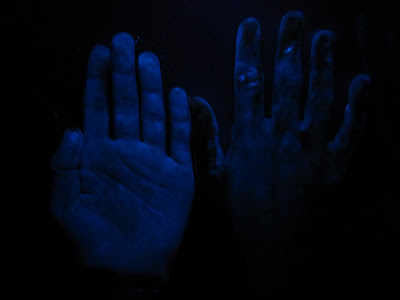 Coco's science project is seeing if a certain brand of soap cleans your hands better or are all soaps created equal? We have some fake germs that she puts on her hands and are visible only with a black light. Here is a picture of her "germy" hands.