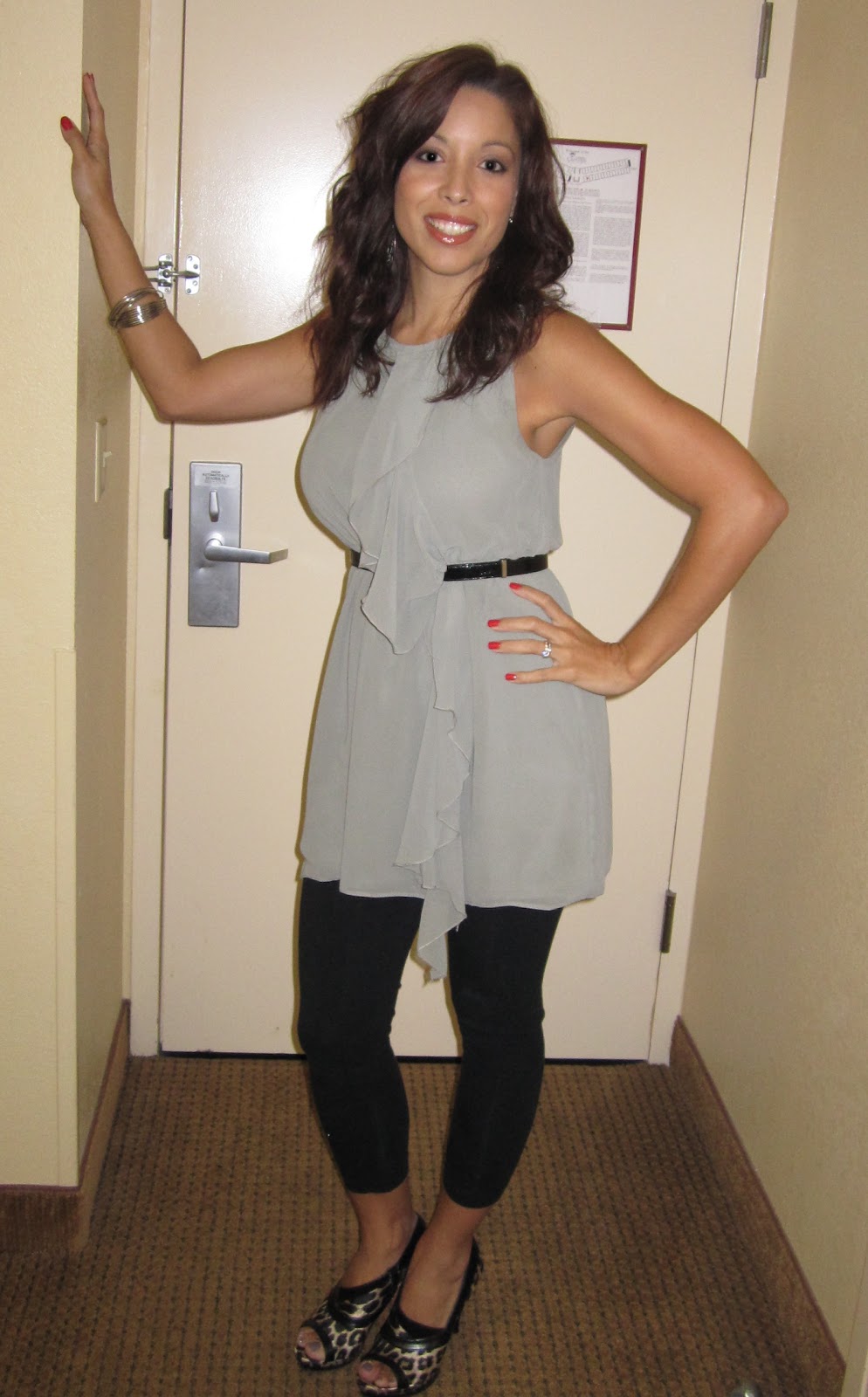 I'm wearing a dress from H&M that I HAD to have. I saw it in a taupe color and thought it would be perfect for the cruise I went on in Sept. But I decided I would wear the clothes I had rather than buying anything new. But I couldn't get the dress off my mind. Low and behold a friend on the cruise showed up with the dress and when I saw how cute she looked, I knew I was going to break down and get the dress when I got back from the cruise. Shortly after we returned, my friend sent me a text letting me know they had it in this green color and in peach. I quickly took the hour+ ride to Orlando and picked it up in green. It has been sitting there for over a month waiting to be worn. It is a dress, but like I said, I knew we would be getting up on the table at the restaurant so I put leggings underneath. I have to admit though, I like it much better without the leggings. I think I paid $35 for the dress, the leggings I have had for years and if I remember correctly I got them on clearance for like $10. The belt I have also had for years and the same with the bracelets and earrings, which you can't see here. The shoes - I LOVE too. I saw these last year on Zappos for about $80. They are by Carlos Santana. I soon saw them at Marshall's for $60. I was so excited to find them at Ross last Dec/Jan for $30. I couldn't resist anymore, so I grabbed them. I have had them almost a year, but I hardly wear them, since they don't go with a lot. But for some reason, I wore them 3 times last week! Go figure.