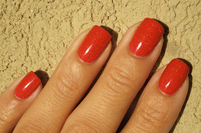 Anyway on to the Holo that isn't. You all know I am working with a lab to create a red holo polish. Here is one of the incarnations that they sent me. This is very beautiful. I received a ton of compliments on it from friends and strangers and even from Juan. It is red with red micro flakies and possibly some micro holo glitter, which is next to impossible to see. I have no clue why the lab would send this as a possibility for me. They must have been joking! So they are back to work on getting it right. However, part of me thinks this could become part of the collection, because it is stunning and pretty, and somehow makes my hands look younger, but holo it definitely is not!
