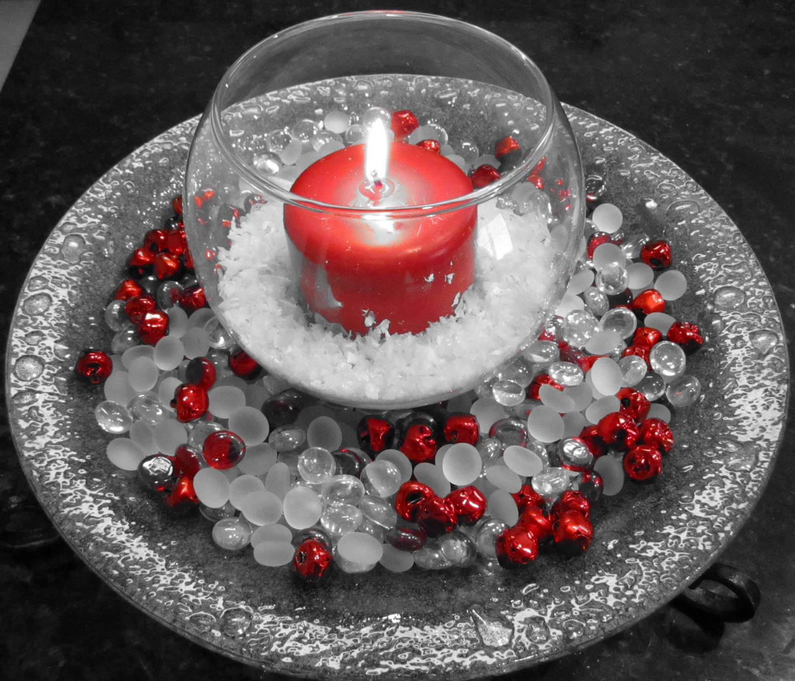 On my kitchen counter. Those are bells mixed with the rocks and some "snow" in with the candle.