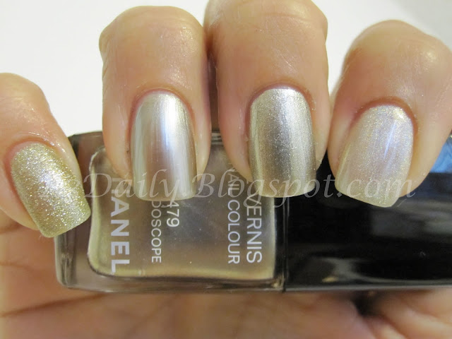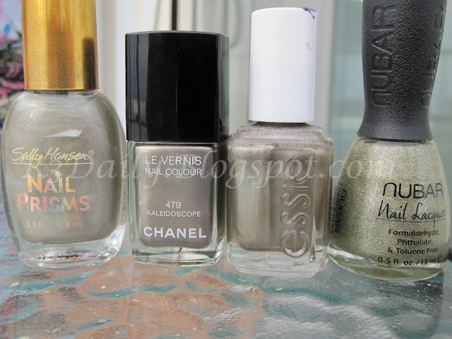 Now for the comparison. I first saw Chanel Kaleidoscope on another bloggers site. I instantly knew I HAD TO HAVE this color. By the time I saw it - it was too late, it was already sold out everywhere. So I tried to memorize the color and started looking for alternatives to the Chanel. First I bought Essie Steel-ing the Scene. This one looked great when I tried it, but it was super smooth & metallic. Not exactly what I was looking for. Next I grabbed Nubar Candy Apple. I knew this one was too glittery, but I thought I could layer it over the Essie and get the look. Now I have to admit - this is one of my all time favorite colors! It is amazing, I layer it over everything! I love the way it seems to transform my nails and make them appear thinner and longer. I can't explain it - but I love it - still not Kaleidoscope though! Next came a Sally Hansen Prism I came across in a dollar store. I LOVE this one as well. But again for layering. It is holographic which I LOVE, LOVE, LOVE! In the bottle, this one is the closest to Kaleidoscope - but not so much on the nail. Finally I was able to obtain my Chanel Kaleidoscope - IN A SWAP!!!! How cool is that? It lived up to the hype and is everything I thought it would be. I love this polish, I love everything about it, the color, the subtle shimmer everything. But after doing these swatches, I think I may need to layer the Prism over the Kaleidoscope. Now that I bet would be amazing!