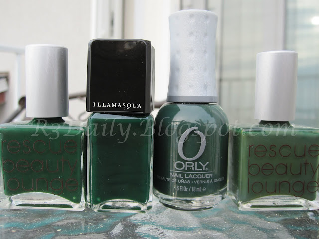 L to R: RBL Orbis Non Sufficit, Orly Enchanted Forest, Illamsqua Rampage, RBL Recycle
