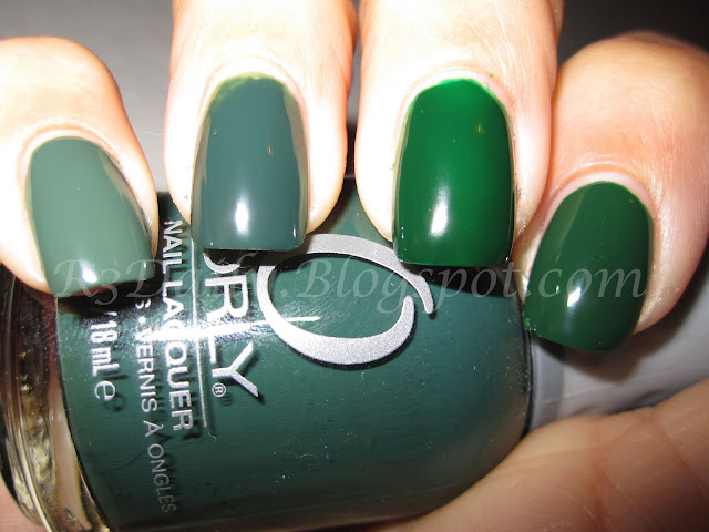 The above picture was taken outside in direct sunlight. ONS is the lightest of the bunch, almost like a chalkboard kind of color. Rampage looks the darkest coming in a shade darker than Recycle - there really isn't much of a difference between the two. Enchanted Forest could be the love child of Rampage and ONS. It is like a grayed out dark green. I held off on getting this green for so long, then it sat in my untrieds just as long, but I really love this color! The colors here are pretty true to color for me. But sometimes when I am inside the artificial light makes them look a bit lighter.
