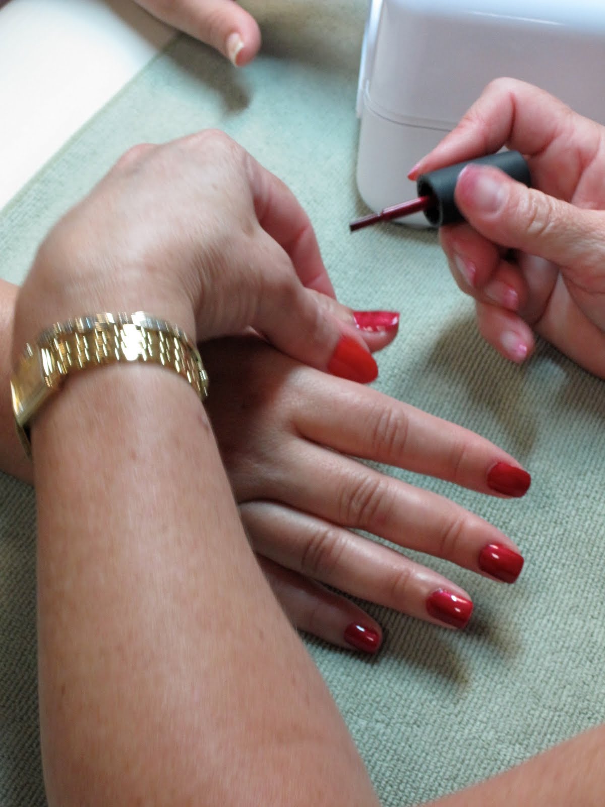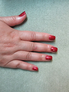 Next it was time for our Shellac Manicures. My friend chose Red Baroness for her manicure color. Can I just say this color is amazing! I wanted to copy her and get this one so bad! But maybe I will make that my next one instead. Here are two pictures of her manicure. You can see in the first picture it really looks just like nail polish being applied. The second picture shows her completed manicure. Doesn't she have amazing nails? I was so jealous!
