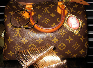 Sheer top is from Target and it was $17.99, the green shrug is also from Target and was $22. I wore a basic black tank under the sheer top. The jeans are Levi's that I scored on clearance at Macy's last year for $20 and the shoes are from a store in town called 8.88. I think I showed them on here before, they cost $8.88. The cameo necklace and stacked bracelets are from Forever 21 and I can't remember how much I paid for them. The earrings I got at Claire's (I think), but you can't see them in these photo's. The purse is my Louis Vuitton and it is always the most expensive thing on me. I can't say the price without feeling a little faint, so we won't mention it here. I just remind myself that it is a classic bag, not a trendy LV and probably one of the cheapest in their collection, and that it cost less than the wallet inside it did. Then I don't feel so bad and then I remember how much Juan paid for the wallet and the faint feeling comes back, so let's just not go there. Ha!
