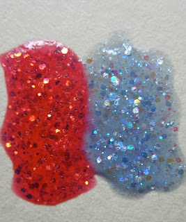 Now that that is over with, I wanted to thank everyone for the help in naming the polish! It really was a great starting point for us in getting this named! I also wanted to comment on a comment that asked if the polish was chunky. Hmmm, I had to try and figure out what the commenter was saying. I think that could mean a lot of different things to a lot of different people. So I am going to try to answer it as best as I can and I hope this is what you were asking. By chunky, I took it as is the polish thick? or is it smooth? or is the glitter bigger than most other glitter polishes? Or does the glitter lay flat? I tried to take some comp pictures to hopefully answer all these possible scenarios. So here we go...