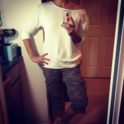One of the military benefits here is that you can rent a small boat for the day at a pretty reasonable price. Tuesday we rented a boat and took the kids tubing. Unfortunately the water was loaded with jellyfish and so the tubing didn't last long. But we road around on the boat for the day and it was a nice relaxing time. I wore this sheer knit sweater that is part of the Rory Becca for Forever 21 line. It was perfect since out on the water I was a bit chilly without it. I then threw on a swimsuit I bought at Kohl's last year and some board shorts from Target. Easy and comfy! You will never see me at the beach or on a boat without my board shorts! LOL!