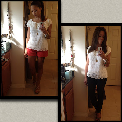 I love this lace detail shirt! I bought this at Express and I want to wear it all the time, I have to restrain myself. LOL! During the day I wore it with bright coral shorts and then I swapped the shorts for black jeans at night.