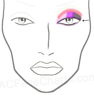 Step 3: I applied a pure black matte eyeshadow in a V shape to the outer 1/3 of my lid. The V shape I did following the shape of my eye at a slight angle to enhance the cat eye look a bit. I used Urban Decay Black Out. (If there is one eyeshadow you should have in a full size it is a good matte black. Regardless of brand, it truly is the most versatile eye shadow you will ever own. IMO) The picture below is for illustration only. I tap on the eyeshadow in this area with a crease brush, it makes it easier for me to apply accurately as the crease brush is a bit smaller. Then I grab a blending brush (I use the MAC 217 blending brush for blending) and blend the black into the pink and back and forth until they are blended nicely, but don't go more than to the middle of your eye lid while blending and try to keep it below the crease. I have to say at this point, I thought this look was going to be a fail, it looked so intense, I almost took it off and scrapped the idea, but decided to just finish it to see what would happen.