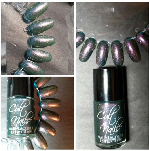Masquerade - A green jelly base packed with a duochrome of purple to copper. The purple overtakes the green for a dramatic effect. This is a thin layerable polish that can be layered over other vampy shades to intensify the effect or you can wear this beauty on it's own.