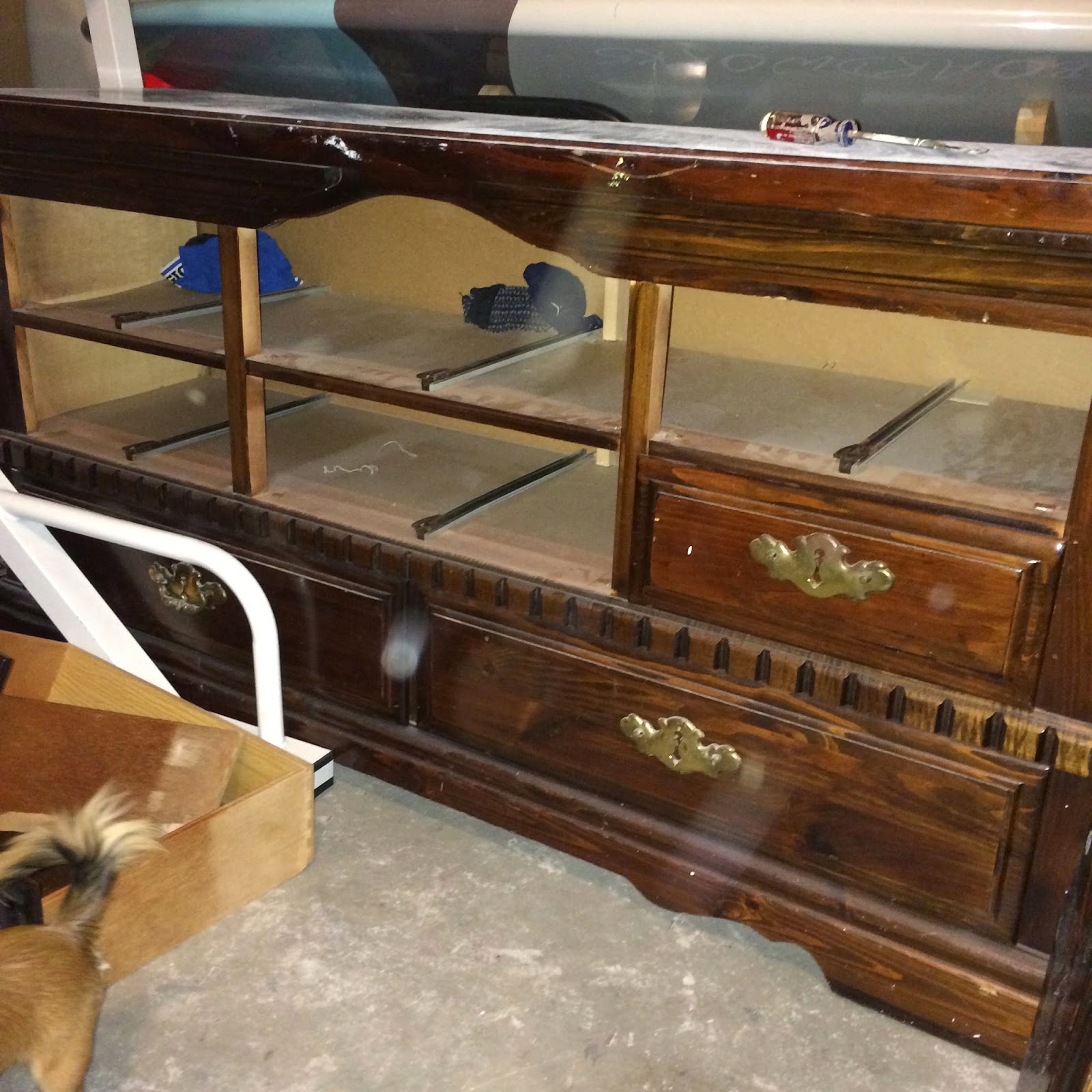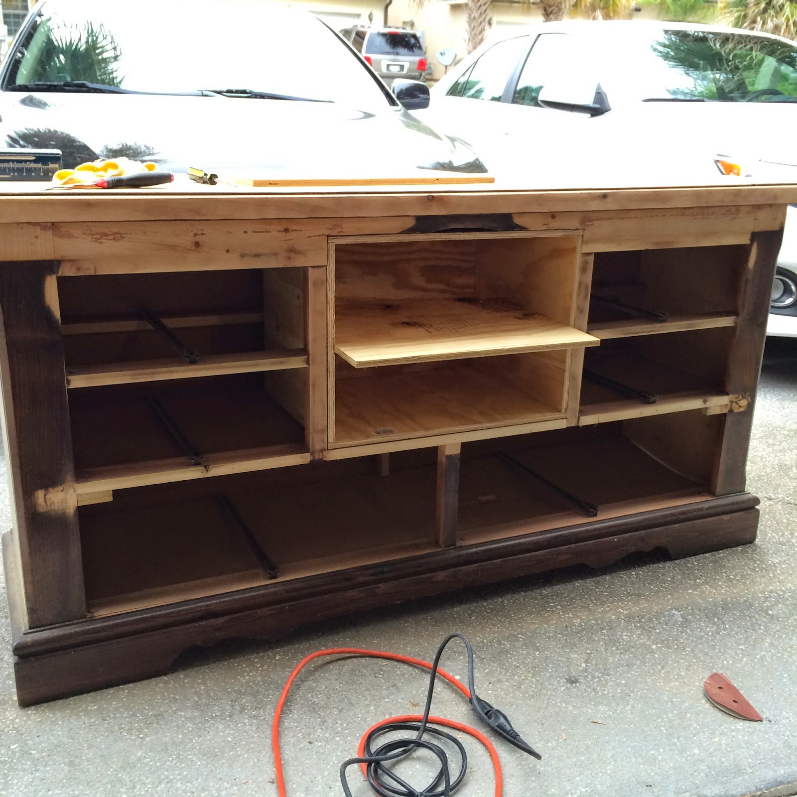 You can see the edging on the piece above the bottom drawers and the simple edging under the ledge of the top. After taking all the drawers out and the leftover socks and underwear (GROSS), we removed the existing edging and then we sawed the middle of the top of the middle so we could remove the 2 drawers there and create a space for shelving that we will use for all the entertainment equipment associated with the TV. From there we sanded the whole thing.