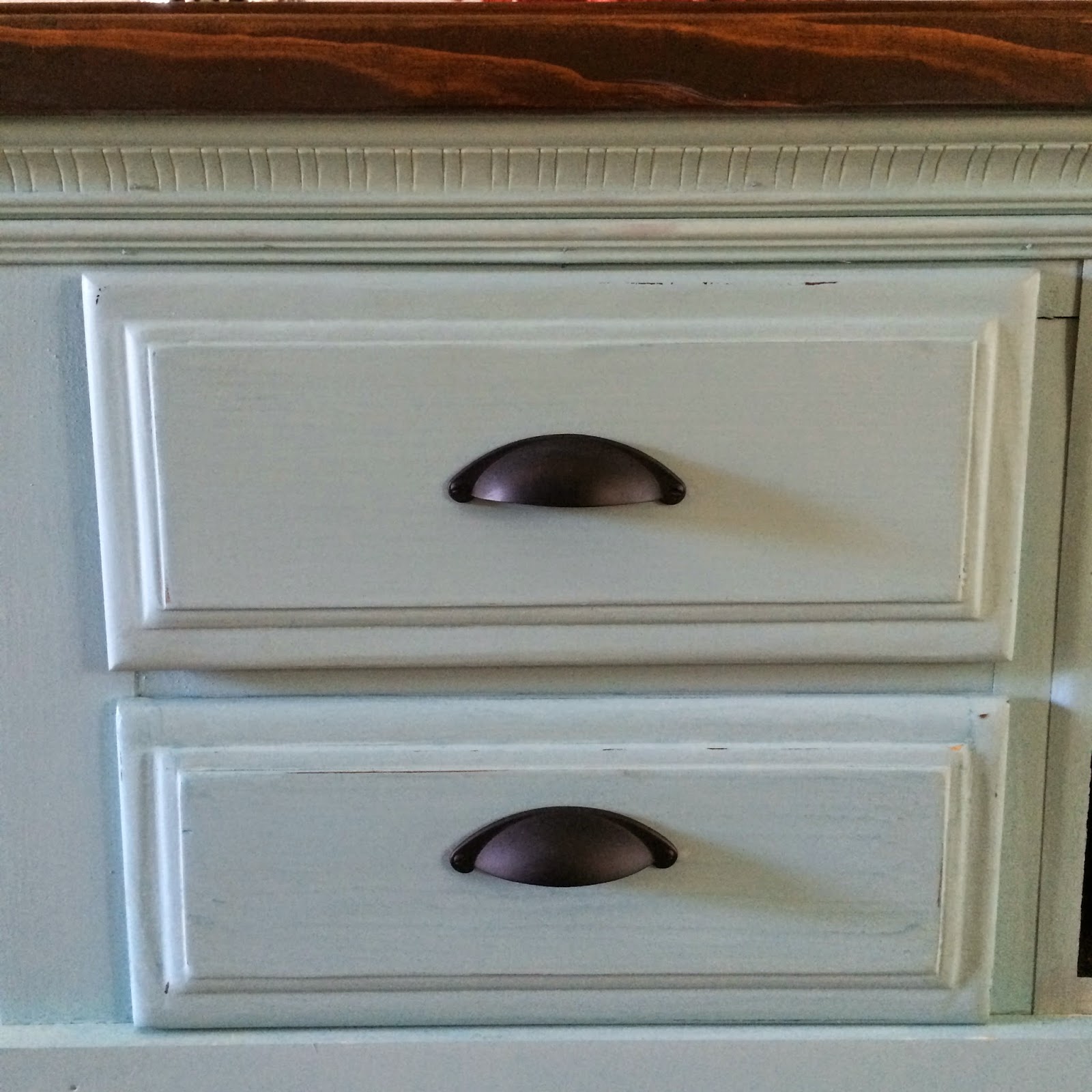 Eaulalie's Sky is a blue/green color, almost Tiffany's Blue. But as I mixed it, it kept coming out blue and I was worried. I quickly realized I wasn't mixing the paint thoroughly enough and once I did, the beautiful green tones started to appear. It ended up taking me two coats on most of the dresser, but because the paint was not coating over where I filled the holes on the dresser really well, I ended up with 4 coats on just the drawer fronts. We used Miss Mustard Seed's Hemp Oil to seal the top and her furniture wax on the rest of the dresser. I didn't want any chipping on this piece, so I added her Bonder into the paint as well. We sanded out some pieces once it was done to age it a bit. I still want to go through with some of her antiquing wax to age it a bit more, but for now, I love how it came out!
