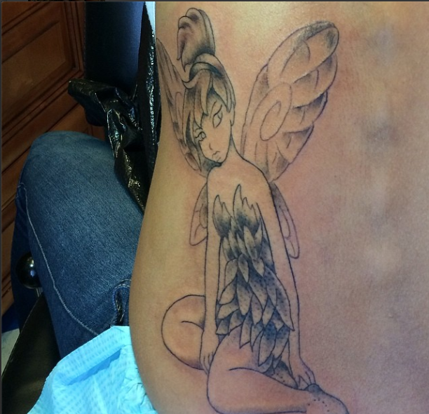 We planned the tattoos for the last day of their trip on purpose, but went in with our ideas and scheduled our appts at the best shop in town in advance. But even with all the planning, there were last minute changes. I have three fairies tattooed on my back already. The tattoo takes almost 1/2 my back. It was done in a sort of comic style, very simple but exactly what I wanted. Originally I figured I would put this Tinkerbell silhouette somewhere on my back, but it just wouldn't mesh well with the existing tattoo and I didn't just want it slapped on there to look like an after thought. So I started frantically trying to figure out where the heck I was going to put a Tinkerbell on my body! My neck? LOL! Not happening! The back of my bicep? Somewhere on my legs? Meh, I already have a tattoo on one thigh, so I couldn't figure out a good placement. I don't want to look like I have a ton of small tattoo's all over my body. I like more of a flow. I have wanted a tattoo on the inside of my forearm, but I like to have them more "hidden" vs being the first thing people see when they meet me. So that spot was the spot I kept coming back to. And I for sure didn't want to make a statement of "Hey look at me! I'm super obsessed with Disney!" by having Tink so visible. But in the end, Kat wanted Tinkerbell's, so I slapped that fairy on my inner forearm. I'm glad I did, it turned out to be the perfect spot for her! I plan on adding to it in time, to make it a bit more than just a Tinkerbell tattoo. I already know exactly what I want to do and can't wait. I love the tattoo and location and I figure, you know what? I'm almost 40, so if people want to judge me because I have a tattoo, they can fuck off.