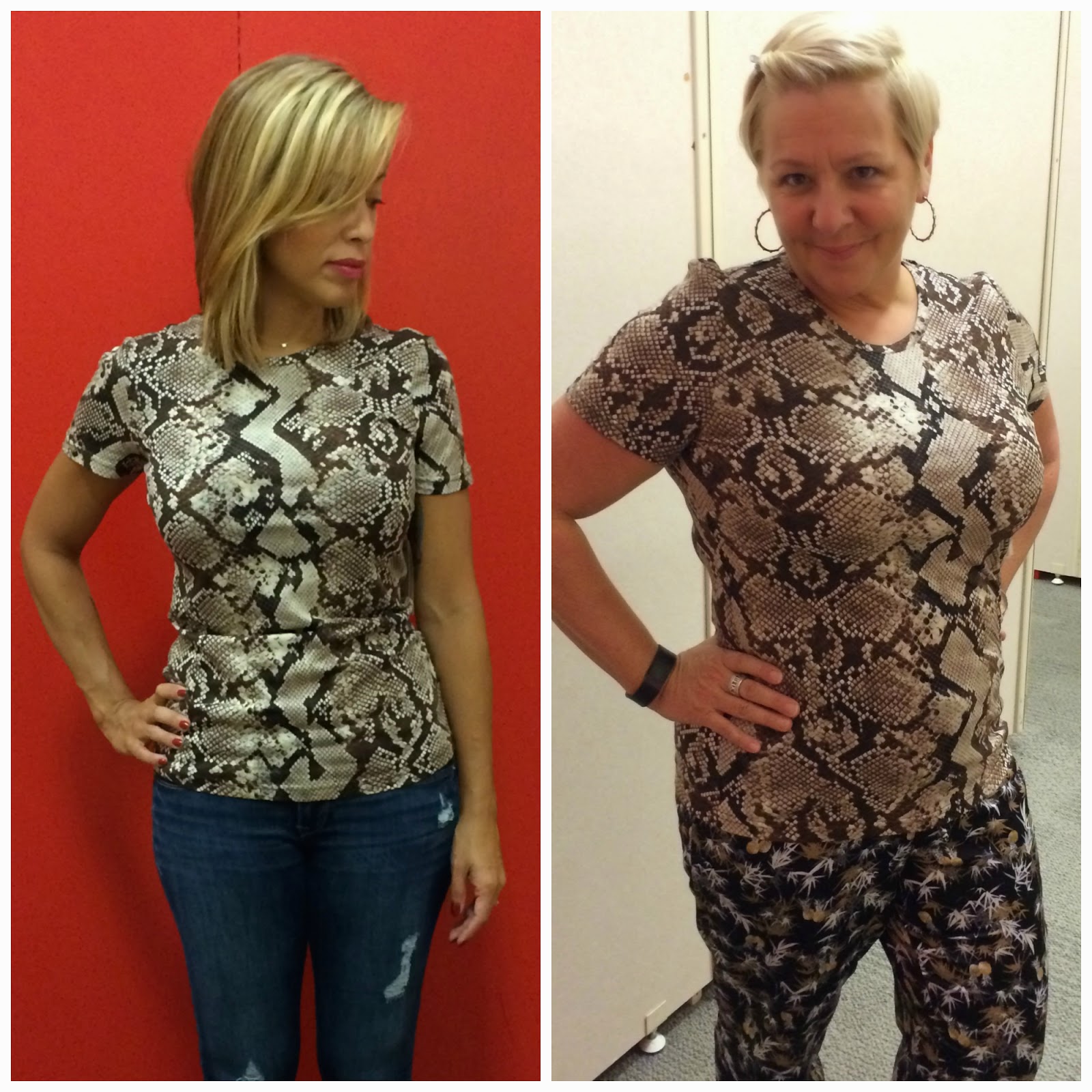 I can tolerate this one more than the long sleeve version. The colors are a bit more muted and it just works better. I have seen a few people on Instagram style this one and it looks great. I like this better on Pam than I do on me. It seems to bunch around my belly, while it is nice and smooth on Pam. But I always have this problem with t-shirts due to the hourglass shape. (Not complaining!) Verdict - This is a good value for the money. It is remarkably versatile and an easy way to wear the python trend.